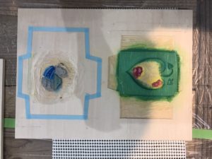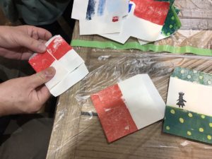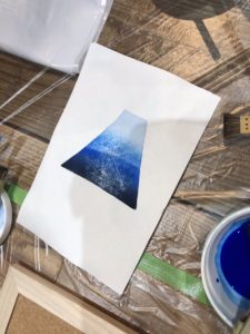 まず版木に絵具をつけて紙を置き、クッキングペーパーの上からプラバレンで刷ります!