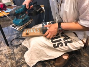 組み立て作業が終わると、お次はサンダーを使って角に丸みをつけたり、おしゃれな感じに削っていきました。