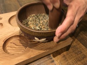 落花生・かぼちゃの種・黒ゴマ・緑茶をすり鉢ですりつぶします。