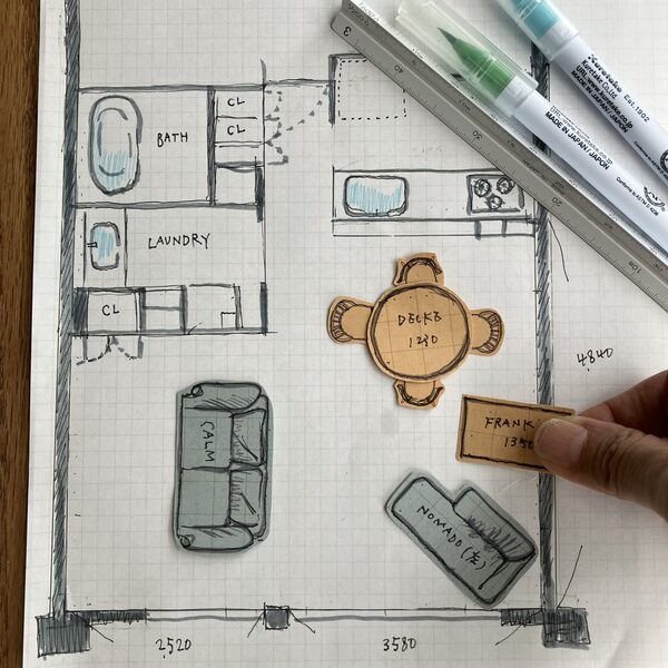家具はお洋服のように試着できないのでお部屋の広さ、生活導線、過ごす人数、家具の大きさなどを考えてまずは間取り図にレイアウト。